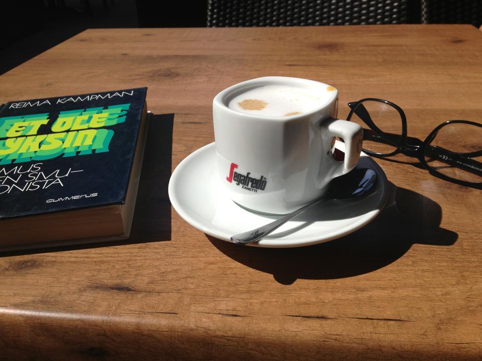 Ostin siis kirjan ja koska aiemmin mainitsemani vakiopöytä kahvilan terassilla oli auringon säteiden saavuttama, tilasin cappuccinon. Luin ensimmäiset 20 sivua ja tilasin toisen. Näin muodostui perinne, nimenomaan aamupäivän kahvina italialaisittain juotuna, cappuccinon ympärille. Onnellisuuden tason nousun saattoi aistia minusta. Auringon lämmössä, ihmisvilinässä, kahvia juoden ja kirjaa lukien, saatoin kuvitella itseni alkuperämaahan, Italiaan. Stressivapaa vyöhyke, tätä on loma!