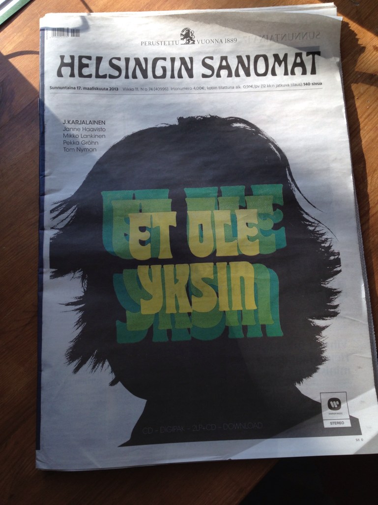 Torilla katselin kukkia ja leipiä. Kirjoja oli useampikin tiski. Tutkin kahden vanhemman rouvan esille tuomaa kirjallisuutta. Ilmeisesti aamu ei myyntinsä perusteella ollut tuottanut heille haluttua tulosta sillä toinen tokaisi ironisesti toiselle: ”Rahan tuloa ei voi estää”. ”Näin on!”. Ikävä kyllä, en minäkään päässyt kauppoihin heidän kanssaan tällä kertaa. Sen sijaan seuraavan tiskin boheemi herrasmies tienasi 12€. Olin juuri kääntymässä kannoillani kun silmäkulmassani vilahti tutun levyn kansi. Hesarissa oli joku aika sitten juttu siitä miten J. Karjalainen oli päätynyt kuvitukseen uusimman levynsä kannessa. Et ole yksin -kirja käsittelee Reima Kampmanin alkuperäisversiossa ihmisen sivupersoonia. Tuli mieleeni heti J. Karjalaisen sanat samannimisen levyn avausraidasta: ”Sä tunsit mut aiemmin Markkuna”. Ihmeteltiin tovi myyjän kanssa sitä ettei kirja ollut mennyt vielä kaupaksi vaikka siitä on ollut aika paljon puhetta.