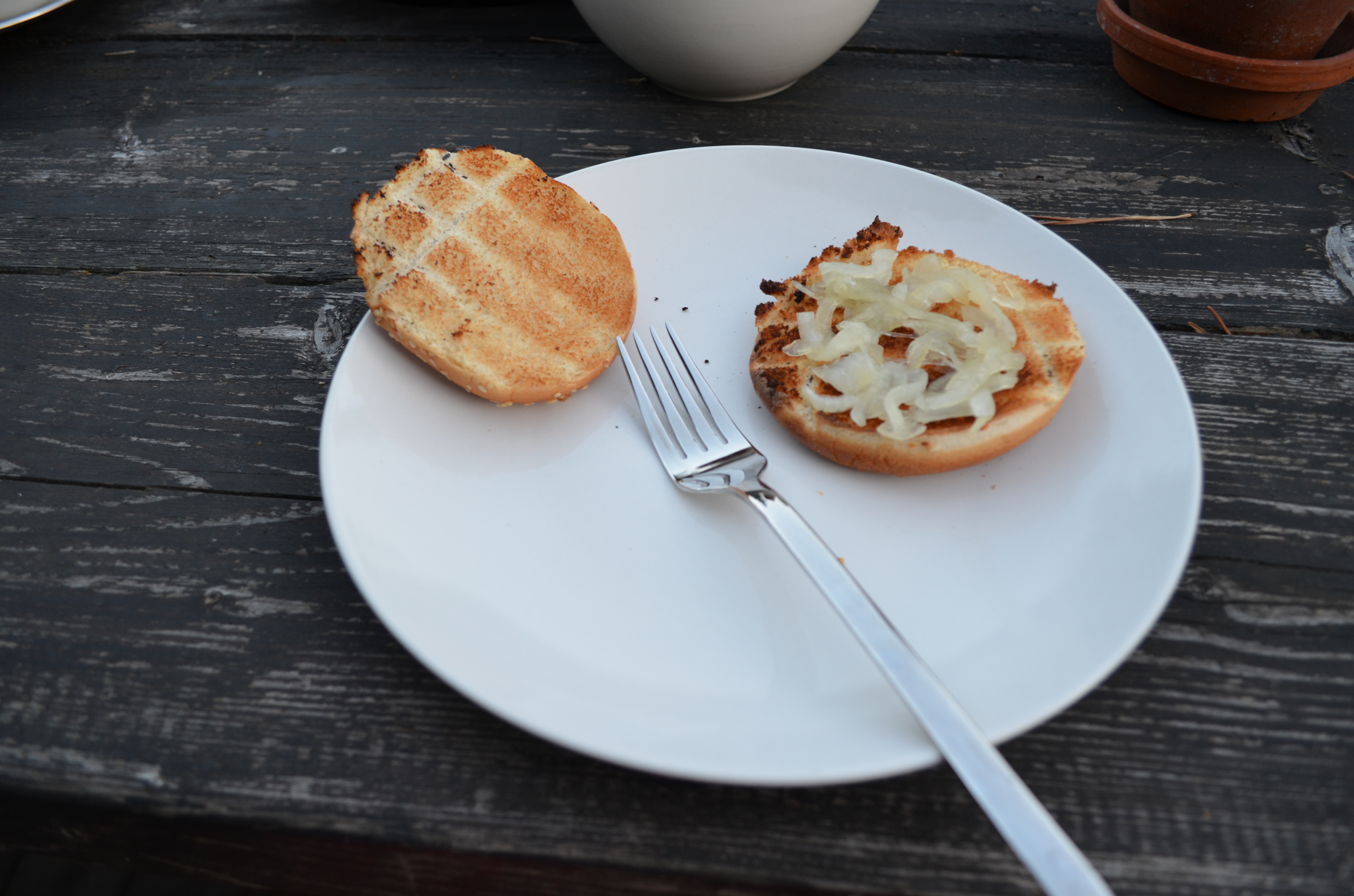 Halsterissa otettiin liekin lämmöstä sämpylöihin väriä ja pintoihin rapsakat raidat. Sen jälkeen hampurilaisen kokoaminen alkoi. Ensin sipuli.