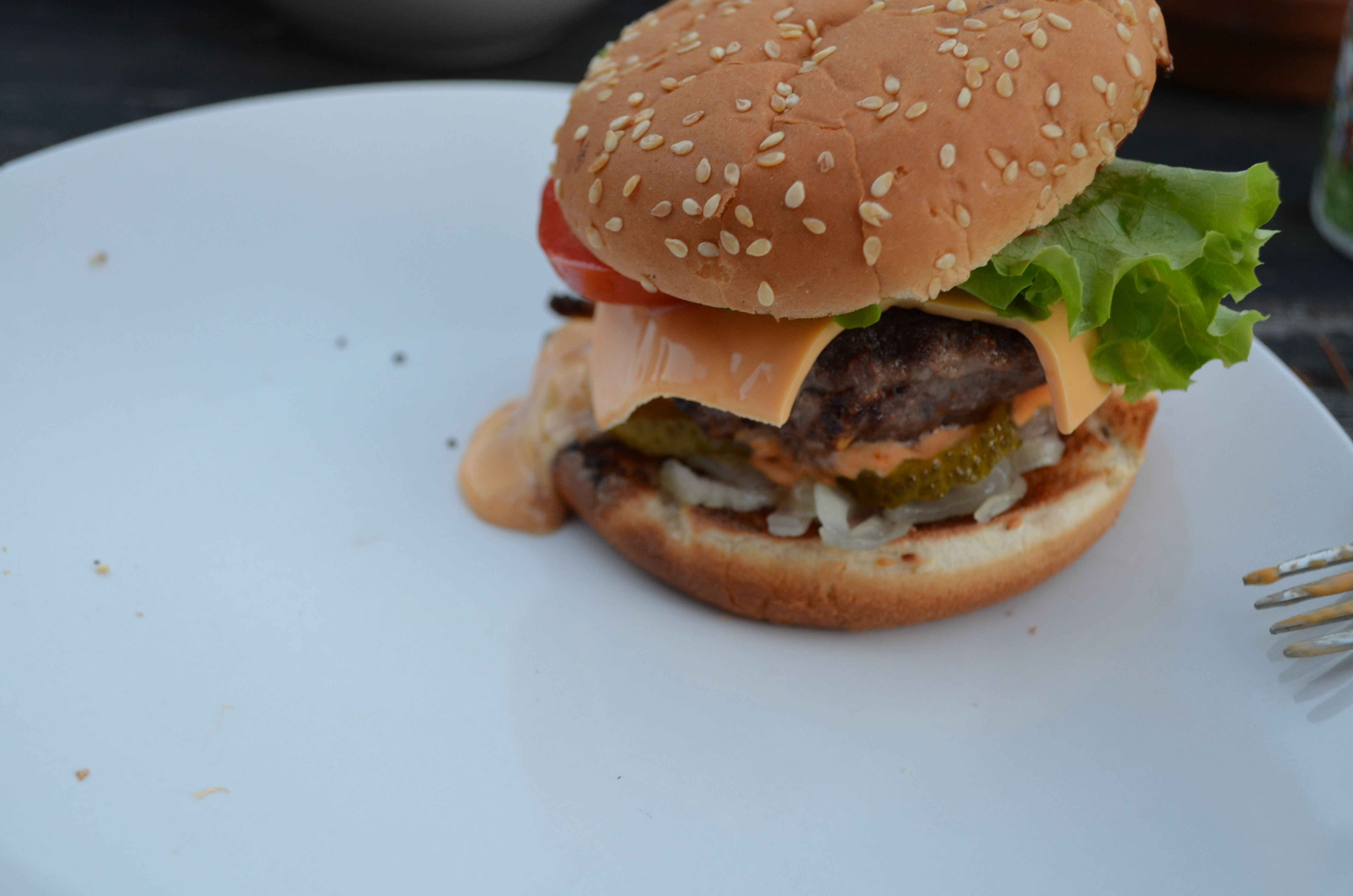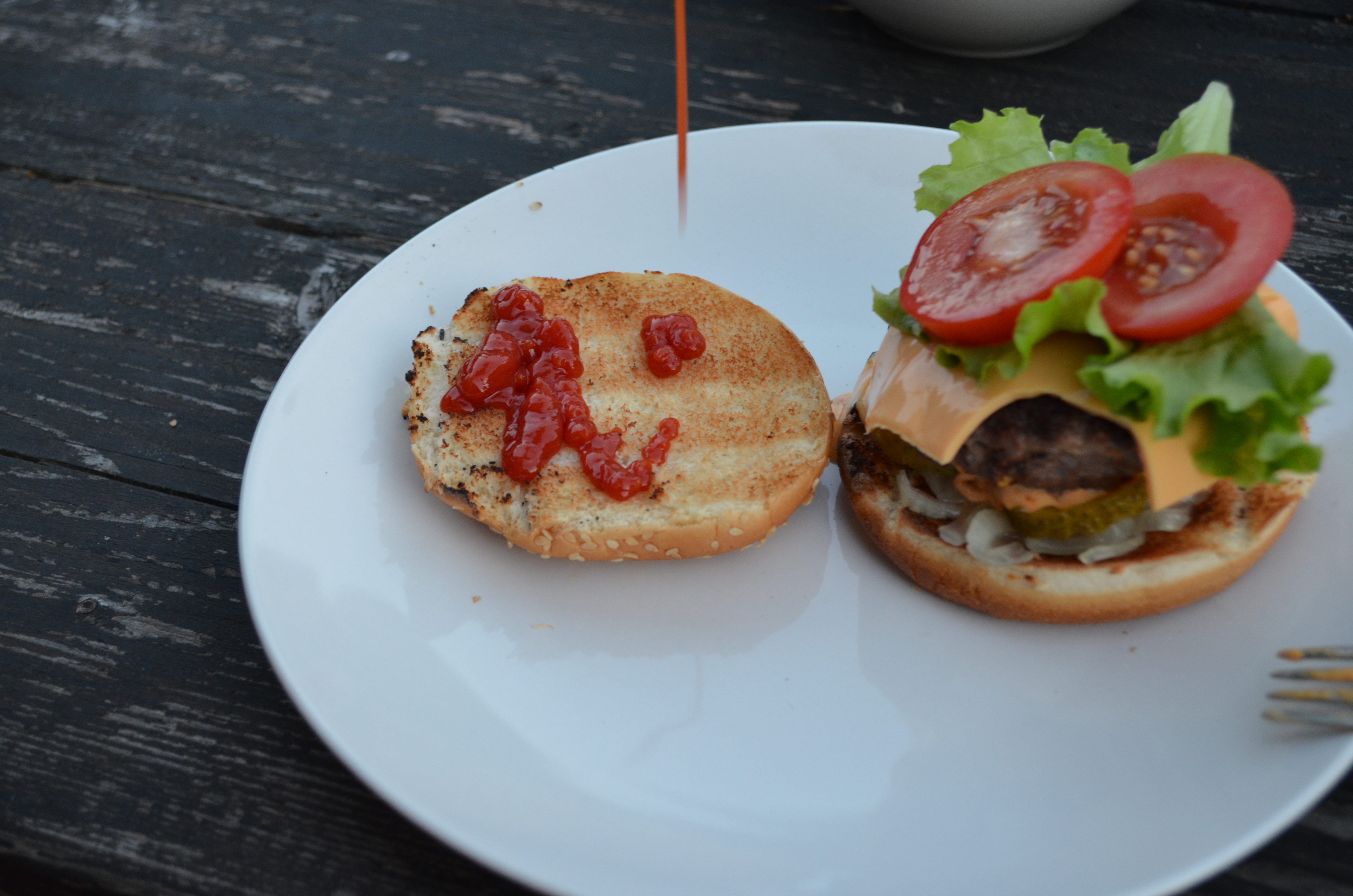 Sitten alkoi kyllästyttää joka vaiheen kuvaaminen. Pihvit valmistuivat ja tuli kiire kasata hamppari. Majoneesi, pihvi, juusto, salaatti ja tomaatti. Ketsupin lisäämisestä piti taas ottaa kuva. Ketsuppia tulikin reilusti, sillä kuvaan piti saada valuvaa ketsuppia. Onnistuttiin.