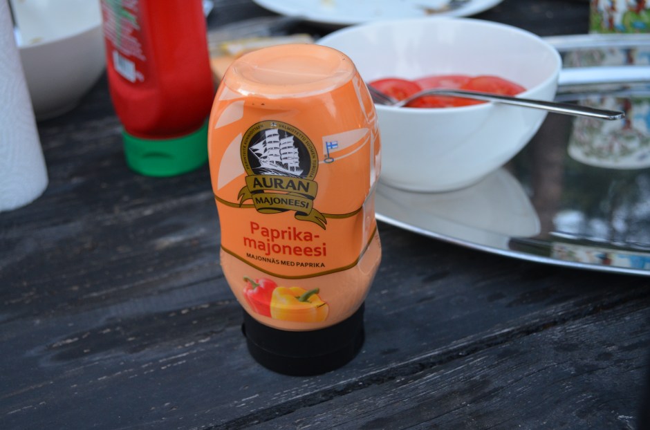 Pihvien tiristessä rasvassa, pilkottiin tomaattia ja sipulia pienemmäksi. Sipulia karamellisoitiin sokerissa kunnes se oli ihanan pehmoista ja makiaa. Makeita suolakurkkuja ja lehtisalaattia, unohtamatta ketsuppia ja Auran paprikamajoneesia.