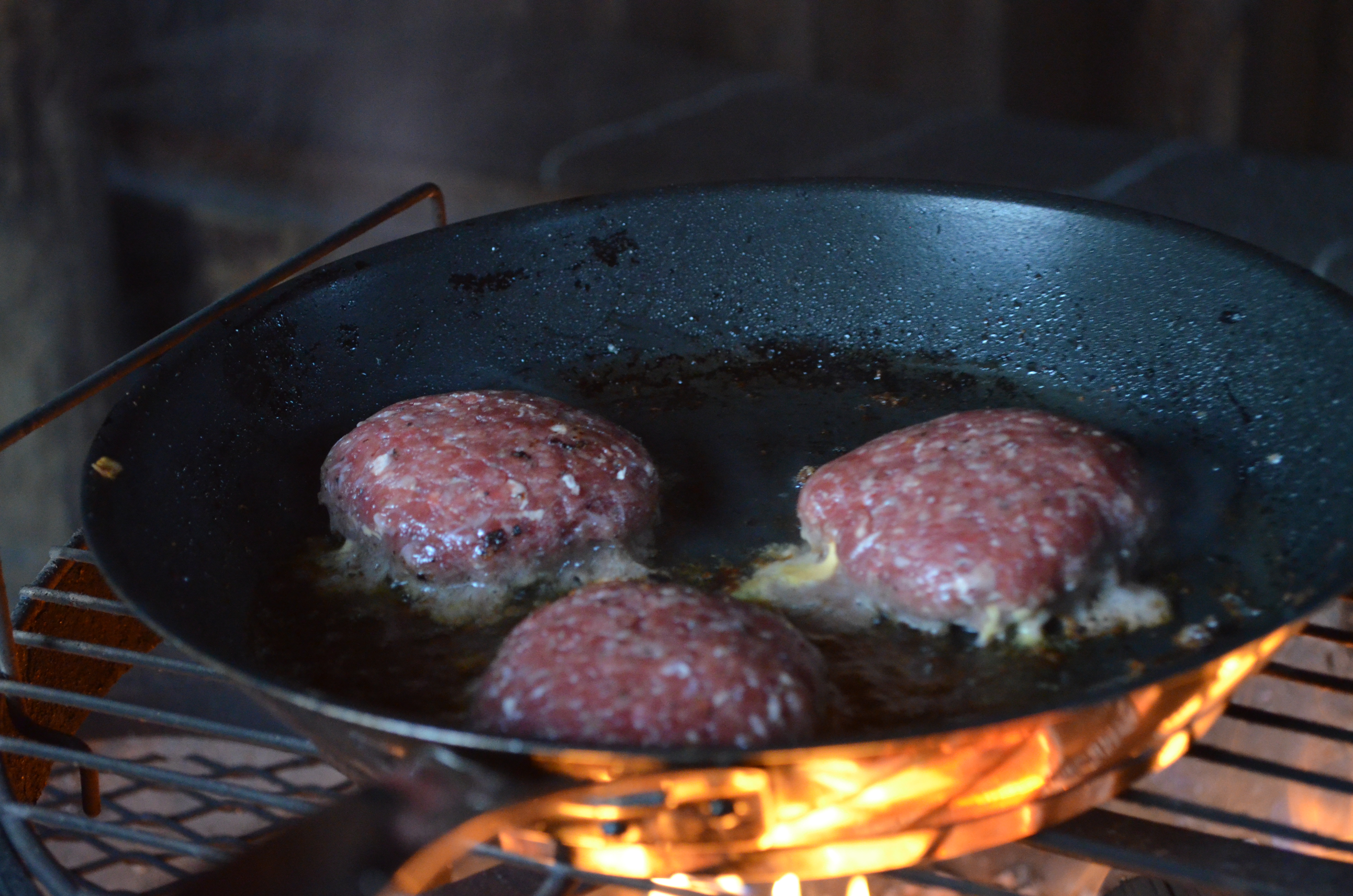Ystäväni syöksyivät keittiööni heti ovesta sisään tultuaan ja ruoan valmistus alkoi välittömästi. Ensin valmistui pihvit. Kaksi pihviä joiden väliin tulee cheddaria. Valmistus ulkonuotiolla kesäkeittiössä.