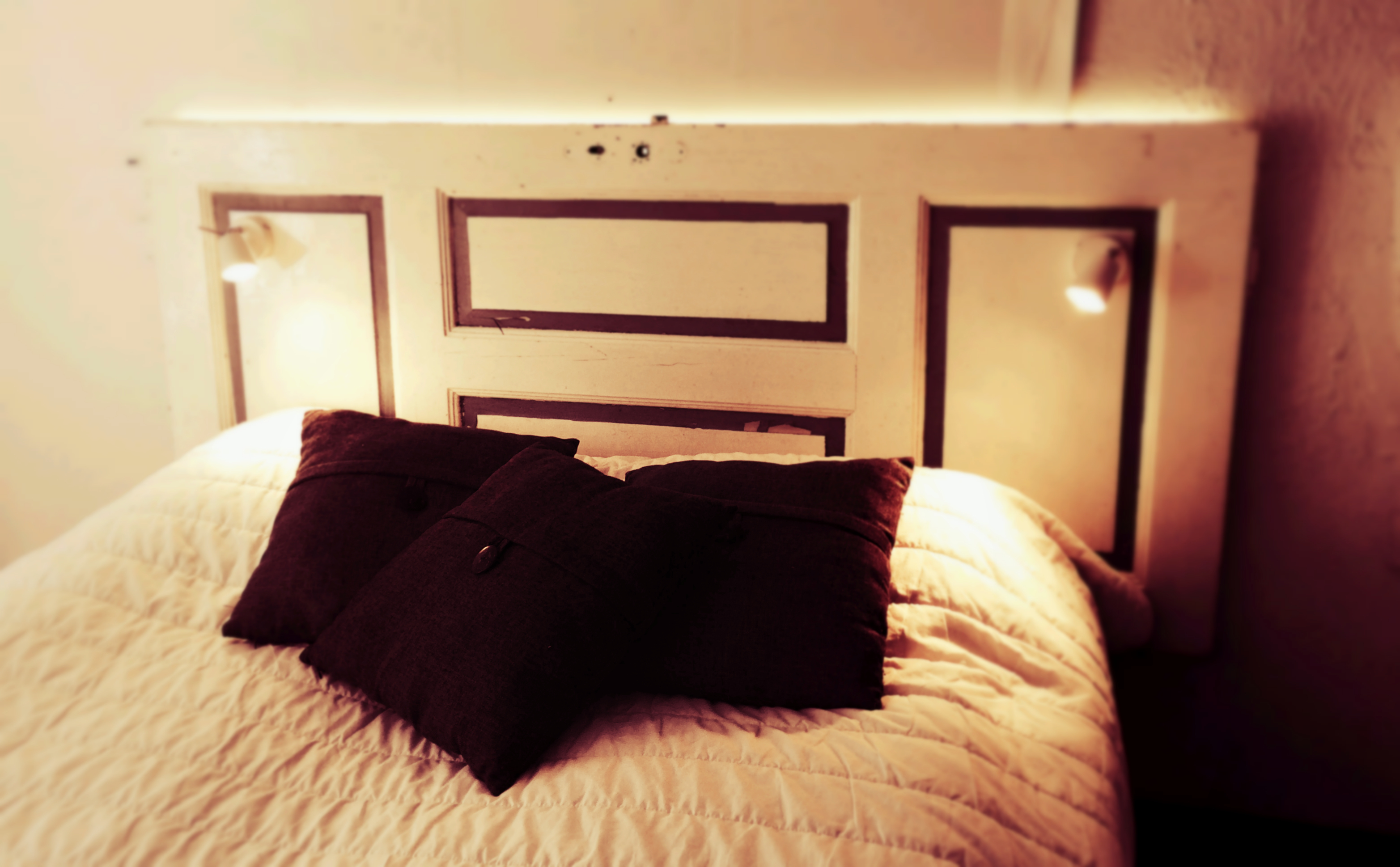 Palattuani kotiin tein sänkyyn päädyn vanhasta ovesta. Asensin siihen kaksi yövaloa ja taakse valonauhan.