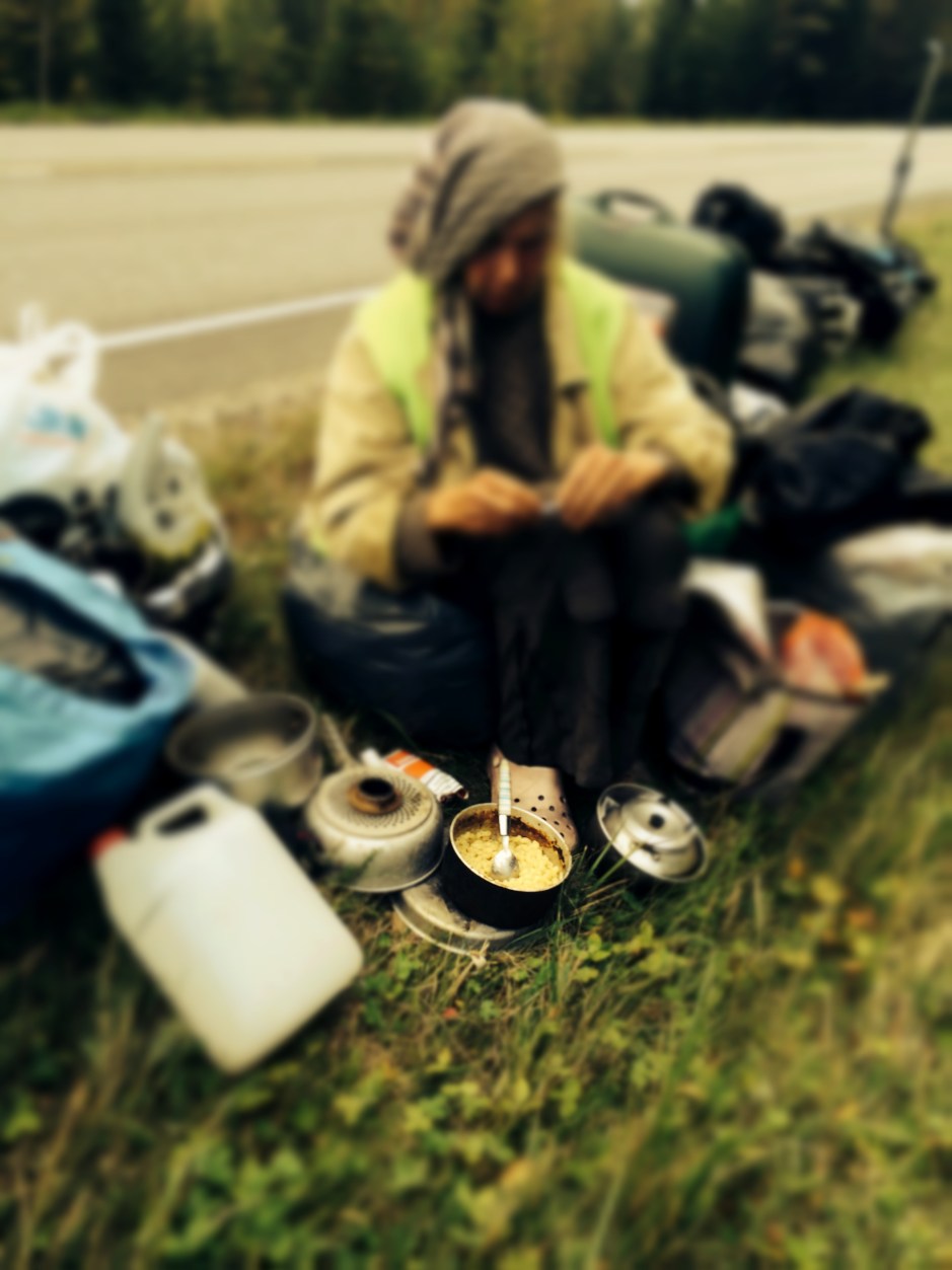 ”Yritän välillä liftata, mutta useimmiten tuloksetta. Bussitkaan ei ota minua kyytiin, ainakaan näiden tavaroiden kanssa”