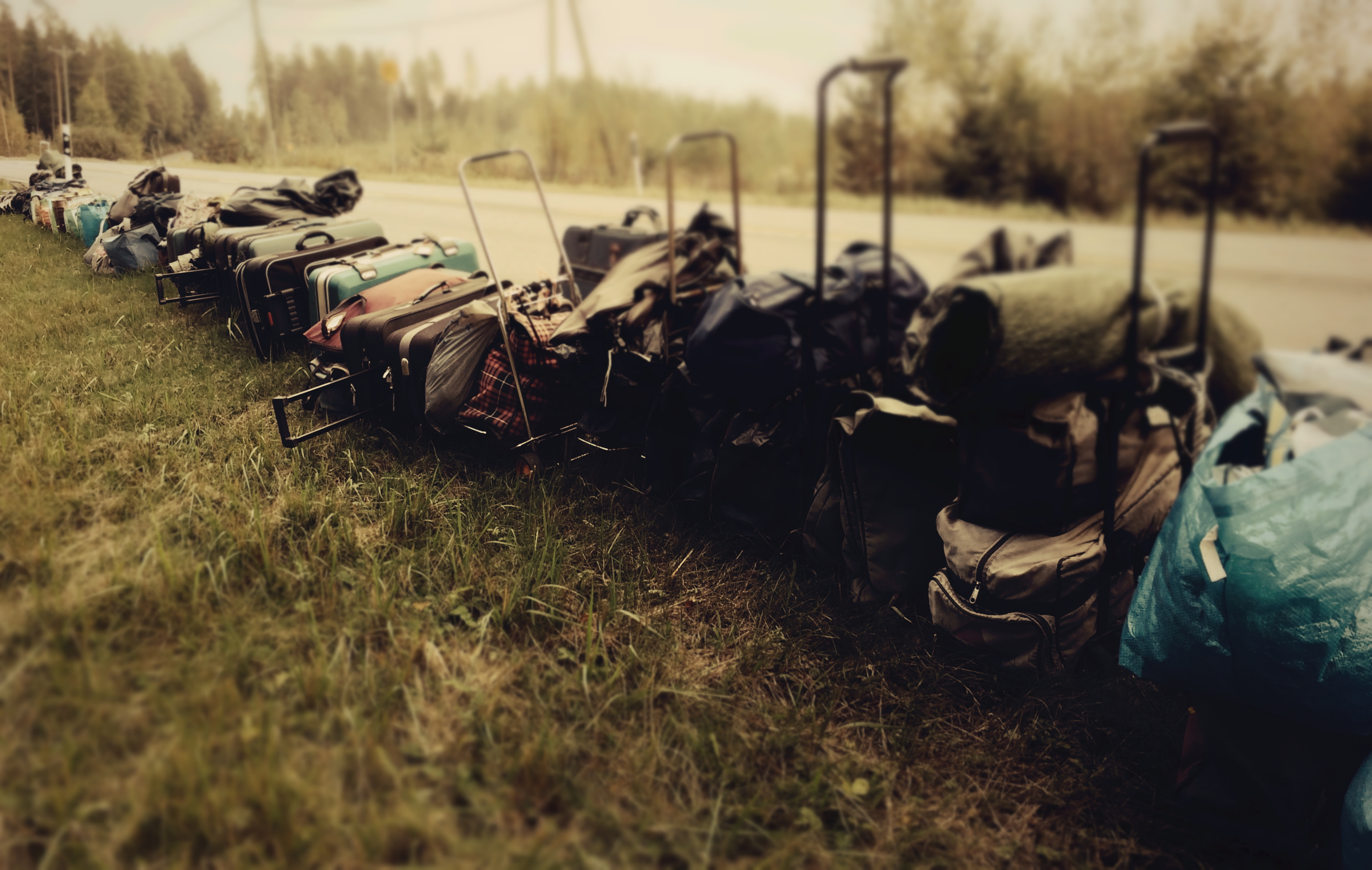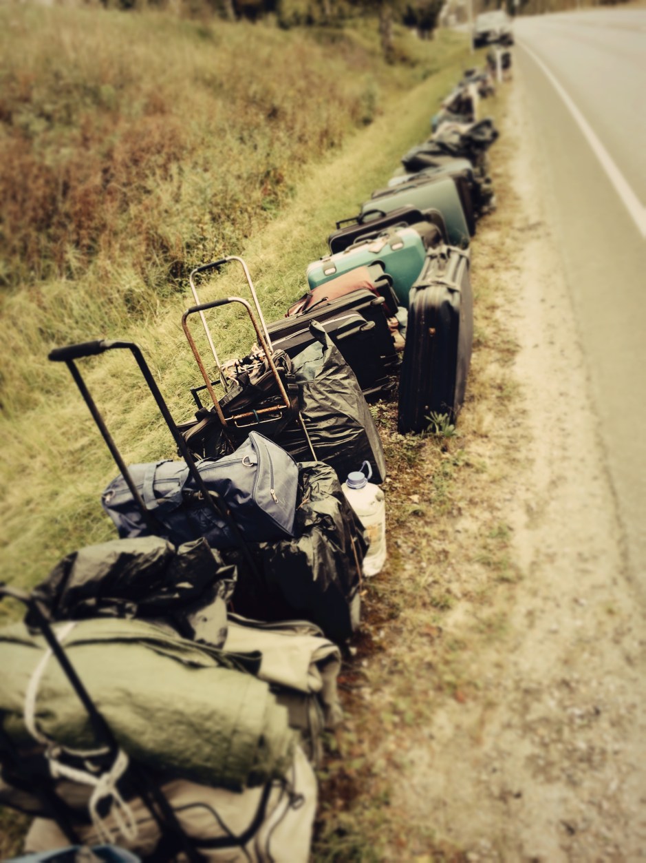 Tien varressa lepää useita kymmeniä matkalaukkuja ja muutamia IKEA-säkkejä. Osassa on pyörät alla, osa on köytetty kaljakärryihin. Noin kymmenen laukun välein jonon päällä on rullalle taiteltu pressu. Ne suojaavat omaisuutta sädesäällä. Ihan kuin uskoisin pressun ratkaisevan vallitsevan ongelman, totean ettei pieni sade taida sitten paljon haitata.