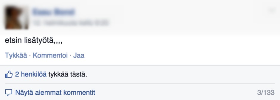 Ilmiö kärjistyy – minnes muuallekaan – internetin keskustelupalstoille. Otan esimerkin Karkkilan Puskaradio -nimisestä Facebook-ryhmästä. Eräs keskustelija kirjoitti sinne etsivänsä lisätyötä.