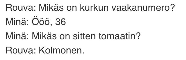 Olin kaupassa vihannesosastolla. Siellä oli vain minä ja eräs vanhempi rouva. Meidän välissämme oli vihanneslaari, jossa oli tomaatteja ja kurkkuja. Minä otin tomaatteja ja rouva kurkkuja. Kuinka ollakkaan, tuli se hetki kun pitää tarkastaa hintalapusta kasviksen vaakanumero. Silloin se pahin valkeni. Minun puolelleni näkyi kurkun hintalappu ja rouvan puolelle tomaatin. Eli me olimme asettuneet laarin ympärille väärinpäin! Selkeästi kokeneempana keskustelijana rouva älysi mitä piti tehdä. Tai varsinkin sanoa.