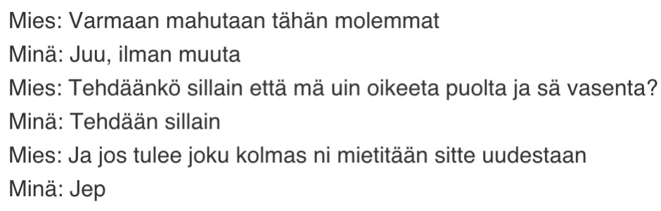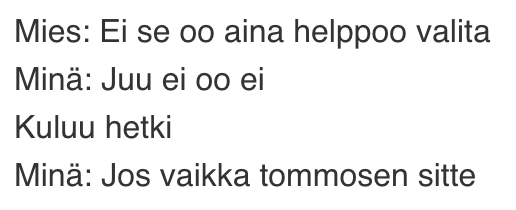 Olin uimahallissa. Tämä on kaksiosainen keskustelu ja siten huomattavasti moniulotteisempi. Pukuhuoneeseen minun jälkeeni tullut mies huomaa että tuhannen pukukaapin valikoimasta meille on sattunut vierekkäiset kaapit ja toteaa: ”Kopit jaetaan näemmä naisen logiikalla.” Hetken päästä kohtaamme altaassa. Siellä on vähän ruuhkaa joten päädymme uimaan samaan karsinaan (vai miksikä niitä sanotaan). Rata? Ennen kroolausta sovitaan kuitenkin pelisäännöt.