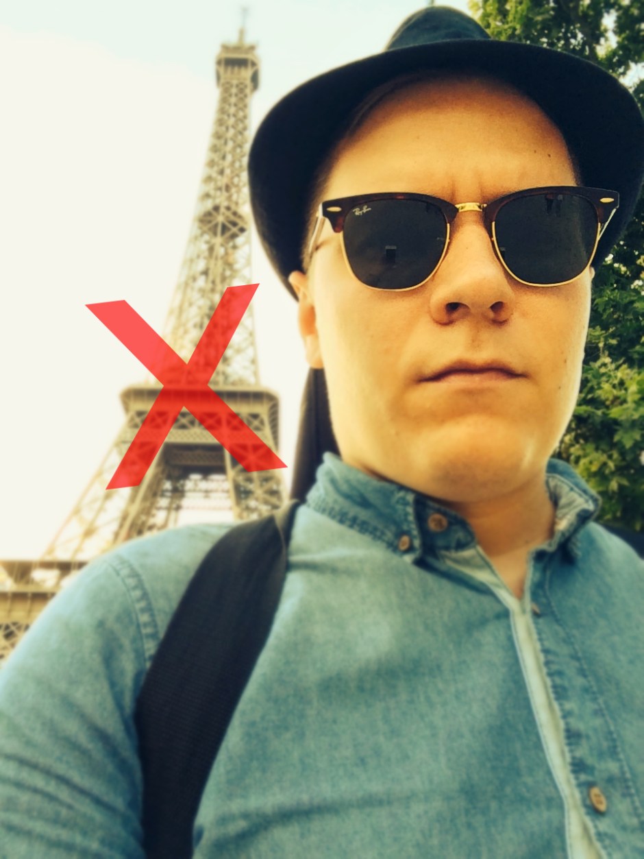 Helpoin tapa toteuttaa hipstermatkustamista käytännössä on tehdä Tripadvisor-haku matkakohteen nähtävyyksistä ja sitten vain olla näkemättä niitä. Joskus se vaatii sitä että taksissa istuessa katsotaan maisemien sijaan omia varpaita tai kuljettajan partaa. Joskus se vaatii nopeaa reagointia, täyskäännöksiä, jos kadunkulman takaa paljastuu joku kuuluisa patsas.