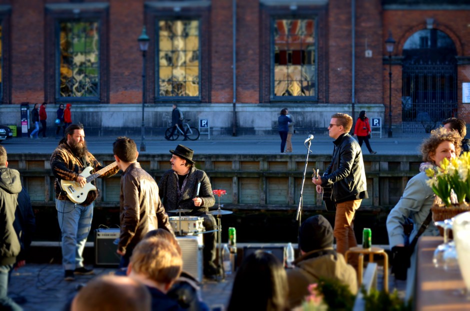 Jatkoimme matkaa kohti Nyhavnia ja siellä sitten annoimme aamupäivän muuttua ihan rauhassa illaksi. Katselimme ihmisiä, aistimme pääsiäistunnelmaa ja herkuttelimme. Jossain vaiheessa trubaduuri sisälläni otti hieman enemmän roolia ja kävin esittämässä yhden laulun paikallisen katubändin kanssa.