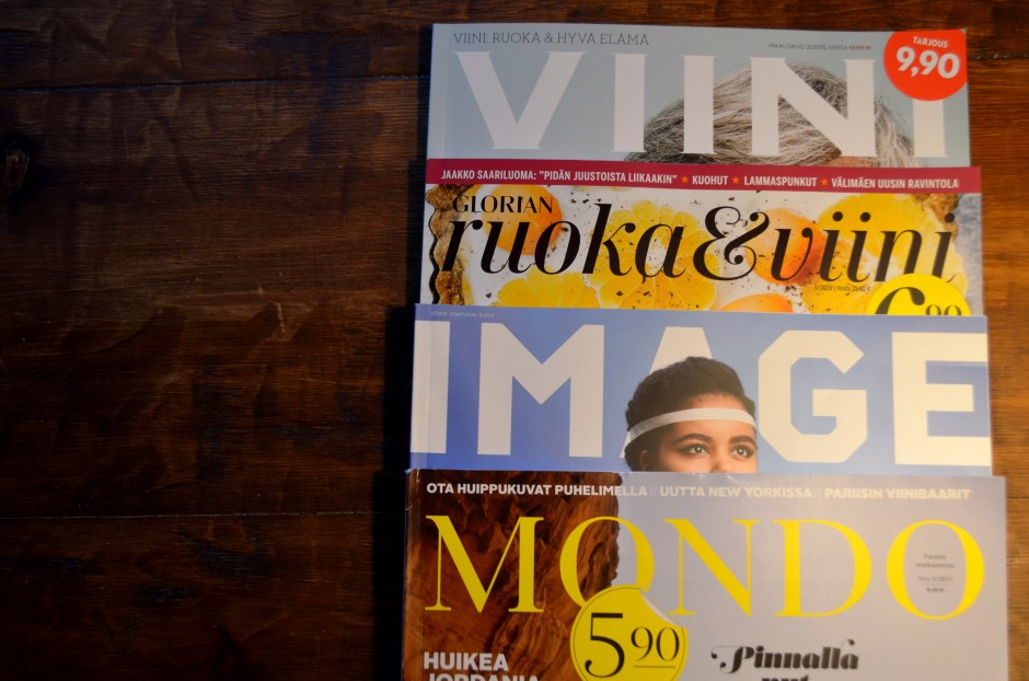 Viini-lehti ja Glorian ruoka&viini täydentävät kokonaisuutta tuomalla mukaan kaksi lempiasiaani, ruoan ja viinin. En ikinä valmista lehtien resepteillä ruokaa ja harvoin tulee ostettua suositusviinejä, mutta se maailma jota niissä lehdissä kuvataan, on se johon haluan kuulua ja jota haluan nähdä.