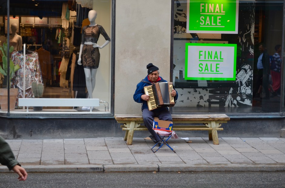 Salaa kadehdin heitä jotka osaavat säätää kameransa vipstaakeja oikeisin ilmansuuntiin tarpeen tullen ja heitä jotka osaavat ottaa kerralla sellaisen kuvan ettei sitä tarvitse pyöräyttää siirapissa ja nompparelleissä ennen julkaisua. Joskus se ruutu onneksi lykästää itselläkin ja mosaiikin seasta löytyy helmi. Kuten tämän kirjoituksen kuvituskuvat jotka valitsin arkistostani sillä perusteella, että kaikissa niissä haitarinsoittaja katsoo minua, vaikka yritin kuvata heitä salaa.