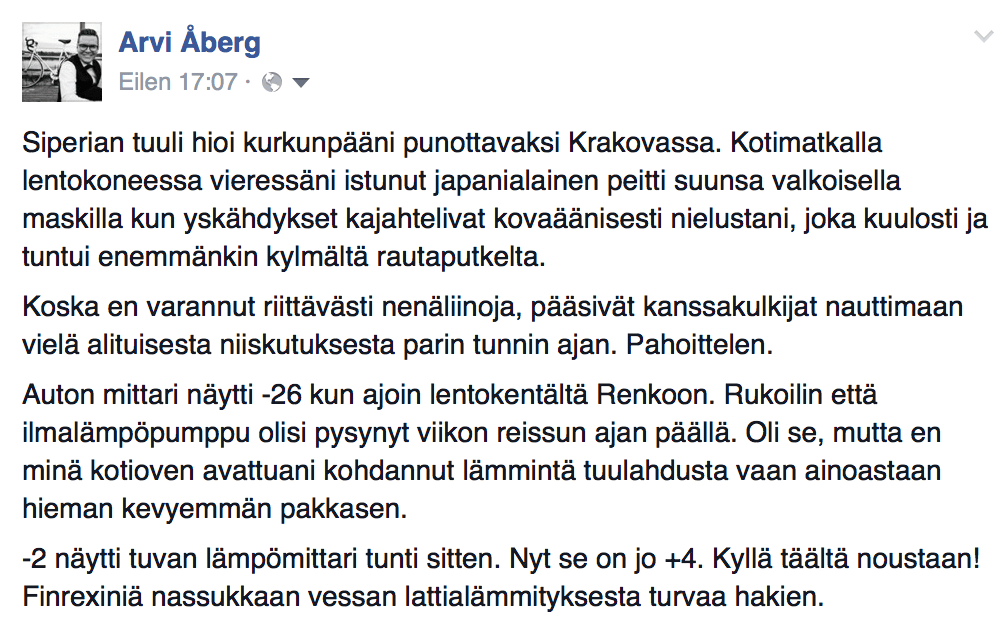 - Nyt ymmärrän, että lattialämmitys on huikein asia. Jos joskus tulee tilanne, että pitää valita asentaako sellainen vaiko ei, asennan varmasti. Se pitää patjani ja siten myös minut lämpöisenä. En tiedä mitä tekisin ilman sitä. Ehkä lähtisin jonnekin muualle sairastamaan niin kuin kaikki fiksut ihmiset tekisivät.