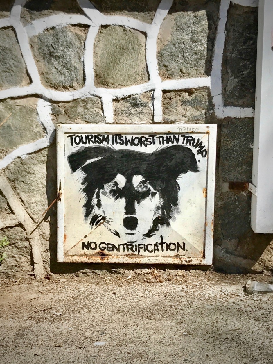 ”We are not hippies, we are happies”, sanoo seinämaalauskin, mutta kaikkia alueen asukkaita selfiekepit eivät selvästi miellytä; ainakin yksi kyltti ottaa kantaa lisääntyneeseen turistivirtaan huolestuneena oman kotimiljöönsä stabiliteetistä.