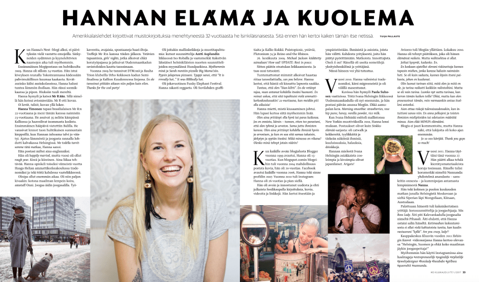 Lehden tukirankana toimii pitkät ja kunnolla valmistellut jutut ykkösluokan journalistien kirjailemina. Vuoden ensimmäisessä Kuukausiliitteessä ollut Tuija Pallasteen tarina Hannan elämä ja kuolema oli mielestäni taidolla kerrottu. Jäi mietityttämään.