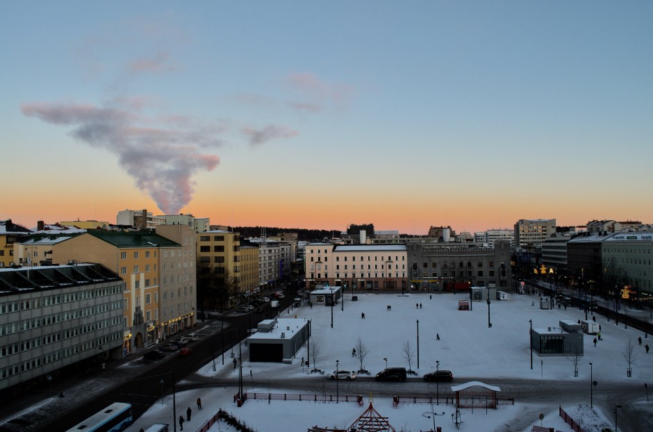 Taivasvärit oli joka päivä aivan maagiset. Helsingistä Lahteen ajaessa ihailin taustapeilissä pakkaspölyn sekaan laskevaa iltapäivän aurinkoa. Lahdessa kirkkaan sininen taivas vaihtui kattojen yllä pienen valkoraidan erottelemana intensiiviseen oranssihehkuun. Perjantaina Tampereelle suhatessa taivaalla mollotti todella iso kuu. Pysähtelin bussipysäkeille kuvaamaan, mutta se oli aina metsän takana piilossa.