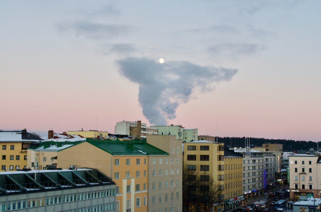 Taivasvärit oli joka päivä aivan maagiset. Helsingistä Lahteen ajaessa ihailin taustapeilissä pakkaspölyn sekaan laskevaa iltapäivän aurinkoa. Lahdessa kirkkaan sininen taivas vaihtui kattojen yllä pienen valkoraidan erottelemana intensiiviseen oranssihehkuun. Perjantaina Tampereelle suhatessa taivaalla mollotti todella iso kuu. Pysähtelin bussipysäkeille kuvaamaan, mutta se oli aina metsän takana piilossa.