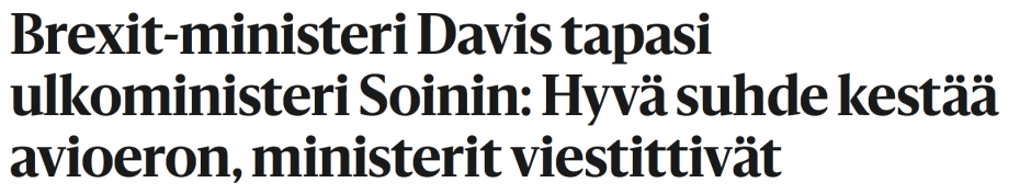 ”Timo Soinin rinnalla brexit-ministeri Davis kiitteli Suomea hyväksi liittolaiseksi.”