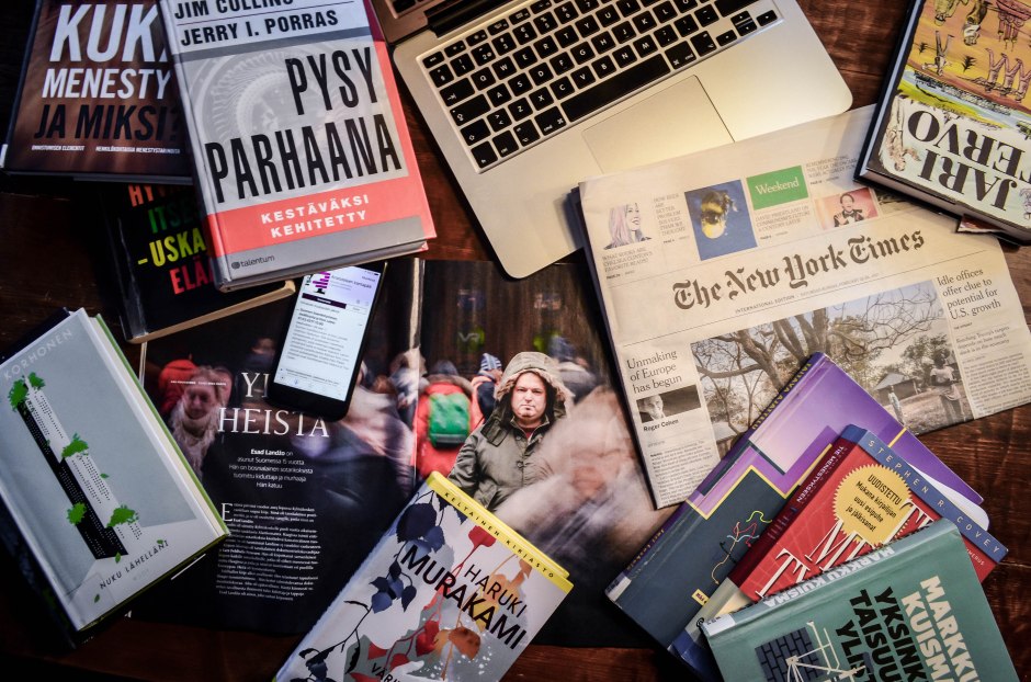 Kirjojen lisäksi haluan esimerkiksi lukea lehtiä, kirjoittaa, katsoa Esa Saarisen Youtube-luentoja ja kuunnella podcasteja. Kaiken lisäksi niitä kirjoja, joita haluaisin lukea, on valtava määrä.