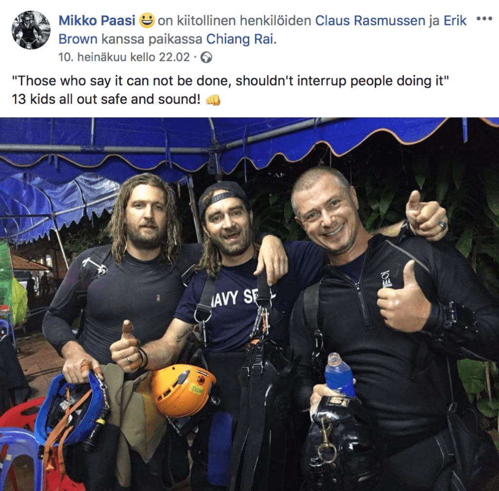 Ihailen pyyteetöntä rohkeutta, jolla Paasi ja muut sukeltajat luolaan lähtivät. Rohkeutta, että menee, vaikka varmasti pelottaa. Arvostan samaan aikaan myös nöyryyttä ja kunnioitusta, joiden kanssa Paasi tuli luolasta ulos.