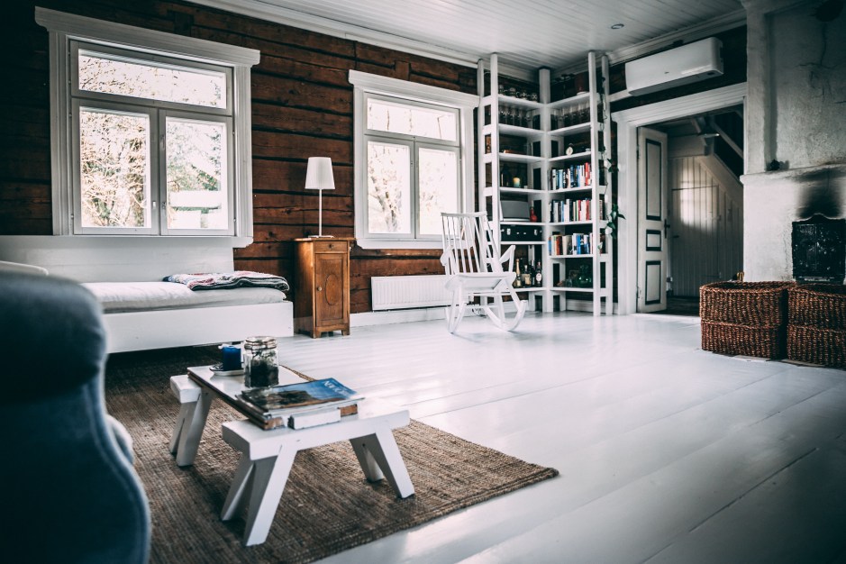 Kevään isoin projekti oli tuvan lattian maalaus. Mustasta valkoiseen. Siitä tuli hieno ja olen kovin tyytyväinen. Samalla maalattiin tuvan nurkassa oleva kirjahylly ja toisessa nurkassa oleva day bed.