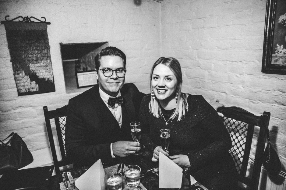 Otimme talvisessa Sibeliuksenpuistossa muutamat potretit ennen kuin siirryimme Hällään häälounaalle. Saimme kellariravintolasta intiimin sellin, johon oli katettu pieni pöytä meitä varten.